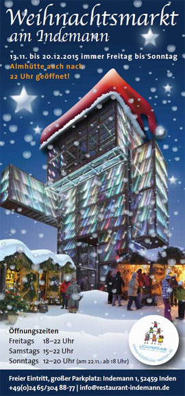 Burgen Schlösser Schwimmbäder MuseenÜbersicht mit Karte Öffnungszeiten und Tipps. Für 2019 liegt uns noch keine Information über den Weihnachtsmarkt am Indemann vor---- alter Text ----Der Weihnachtsmarkt am Indemann bei Eschweiler öffnet vom 25. Indeland steht für die behutsame ökologische und ökonomische Modernisierung einer Region voller Geschichten und Geschichte.
